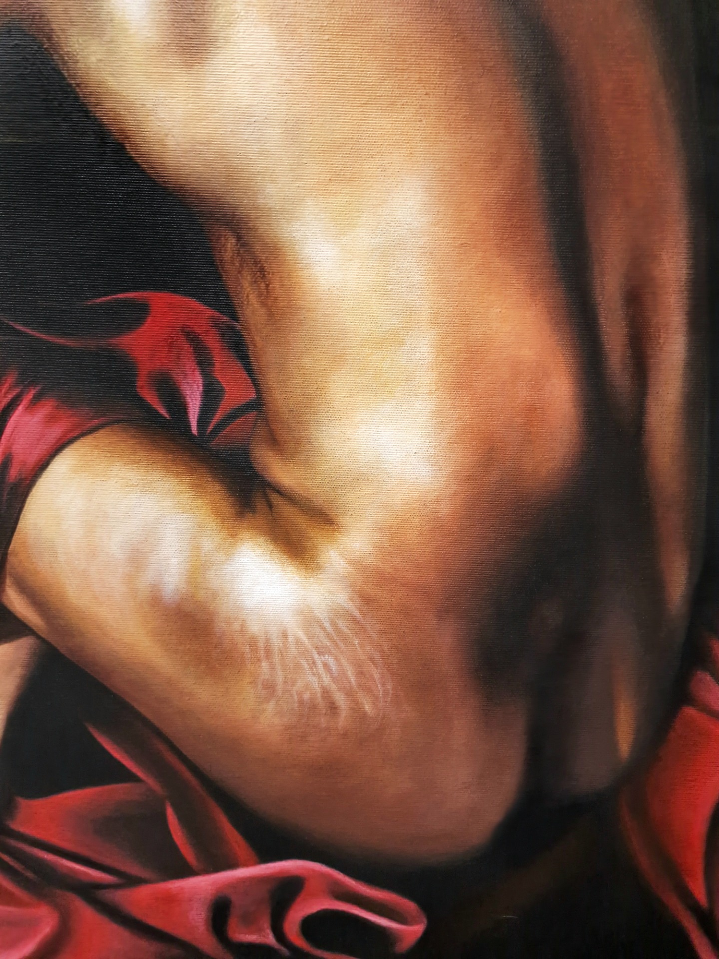I sought to create an atmosphere of both stillness and tension through the contrast between the rich red of the fabric and the deep darkness surrounding me. I dedicate this painting to all artists who know those moments when time stands still, and you simply wait with patience for the muse to finally arrive.